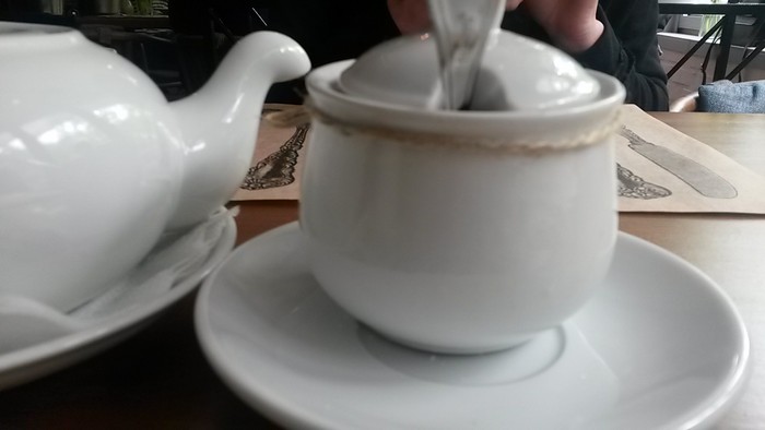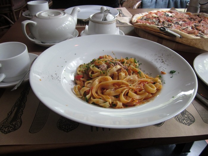Мы заказали пиццу с ветчиной и грибами за 68 грн, тальятелле с тунцом под красным соусом за 56 грн. и фруктовый чай за 20 грн., который подается в поллитровом заварнике. Пока ждали заказ, обратили внимания на обилие крошек на полу под столом, которые видимо не убрали после предыдущих клиентов, они аж хрустели под ногами.
