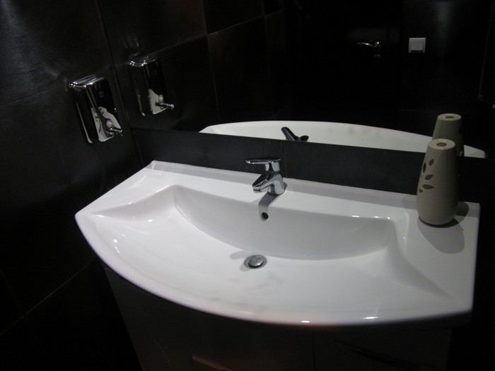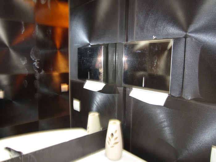 Пока мы ждали обед, пошли помыть руки. Так как в заведении были первый раз, чуть не попали на кухню, дверь в туалет - никак не подписана, пришлось спрашивать месторасположение санузла у бармена. Туалет находится во втором зале, за массивной глянцевой дверью без надписи. И уже за дверью есть еще 2 зала, где обозначена дамская комната (налево), и мужская (направо).