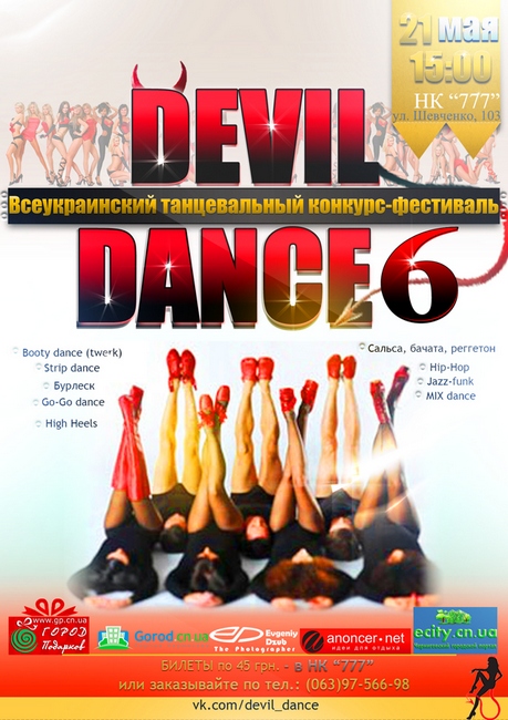 21 мая 2016г. в 15:00 в Чернигове в НК «777», по адресу ул. Шевченко, 103, состоится Всеукраинский конкурс по современным, клубным и эротическим танцам «DEVIL DANCE 6».