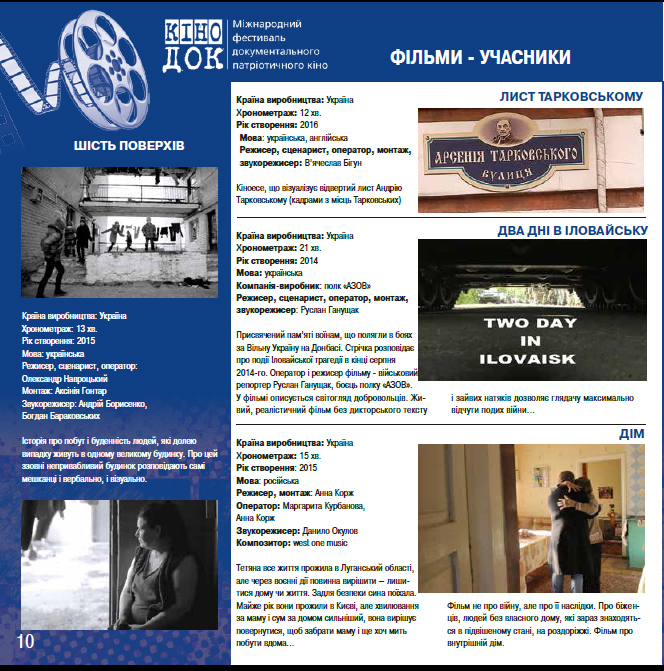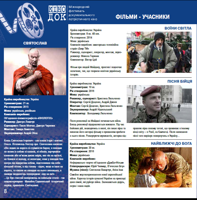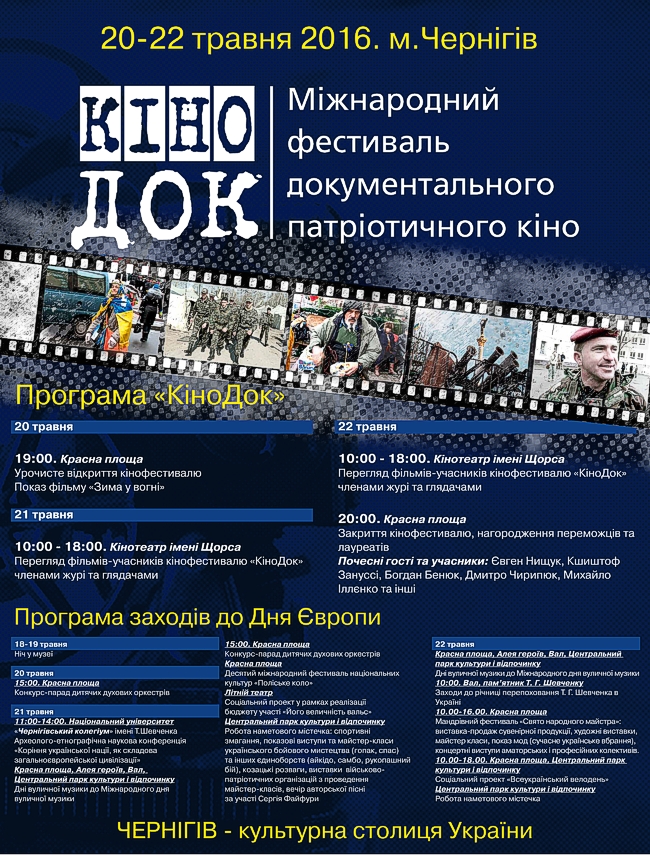 – В целом, программа первого Международного кинофестиваля документального патриотического кино «КиноДок» станет частью масштабных мероприятий, которые пройдут в Чернигове ко Дню Европы, – сообщил директор Департамента культуры и туризма, национальностей и религий Черниговской ОГА Александр Левочко. По его мнению, проводимые на этой неделе мероприятия будут интересны не только жителям города и области, но и привлекут большое количество туристов в наш город.