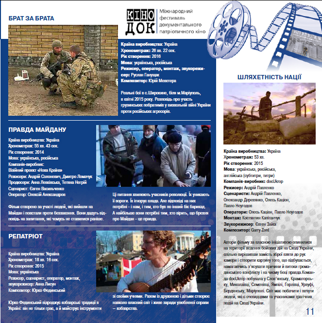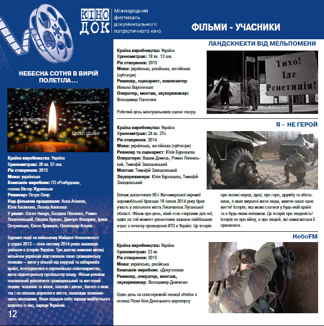 – Мысль снимать кино, наверное, пришла не только ко мне во время событий на Майдане. В будущем это кино будет помогать нам помнить все хорошее, анализировать происшедшее и предупреждать те плохие события, которые с нами произошли. И, говоря сухим деловым языком, наилучшим продуктом в данном случае является именно документальное кино, потому что оно фиксирует происходящие события и позволяет в любое время знакомить с ними широкий круг общественности, – считает инициатор проведения кинофестиваля документального патриотического кино «КиноДок» Анна Левковская.
