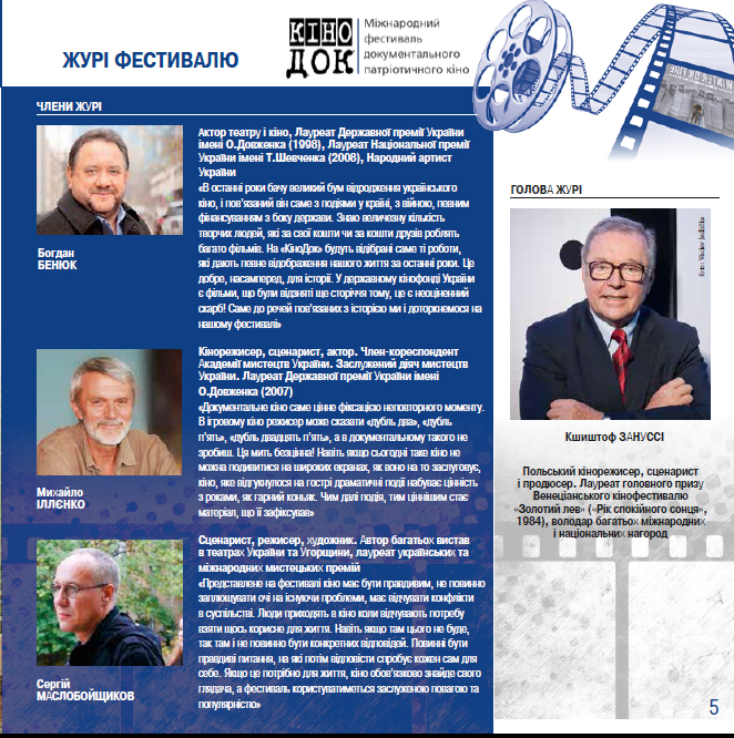Организаторы фестиваля гордятся, что председателем жюри «КиноДок»-2016 согласился стать всемирно известный польский кинорежиссер Кшиштоф Занусси. В состав жюри также вошли наши соотечественники – народный артист Украины Богдан Бенюк, Михаил Ильенко, Сергей Маслобойщиков.
