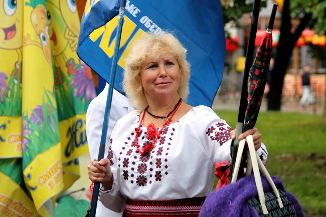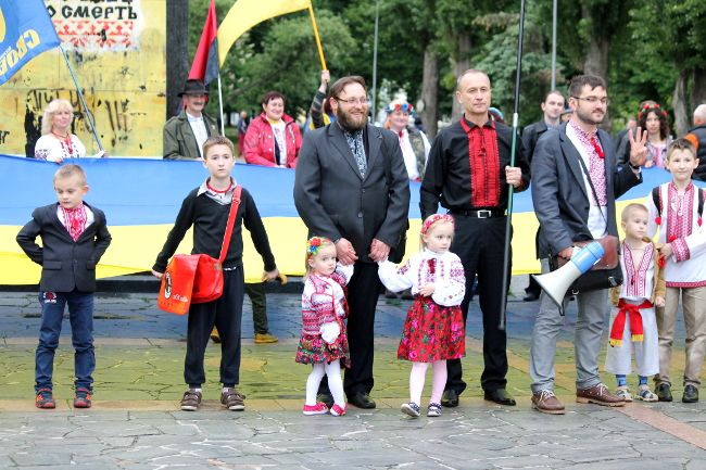 По ходу марша звучат лозунги: «Слава Україні – Героям Слава!», «Слава нації, смерть ворогам», «Україна понад усе». Организаторы призывают прохожих присоединяться к маршу, ведь вышиванка выделяет украинцев от остальных национальностей. Таки да! Призывы возымели успех. Пока дошли до Красной площади, колонна увеличилась вдвое.