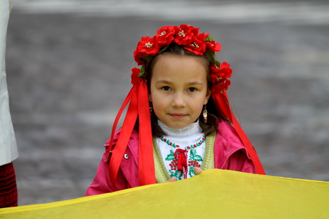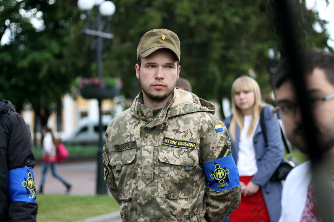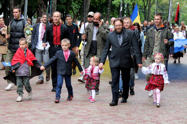 К назначенному времени – 18.00, в парке напротив ТЦ «Мегацентр» стали собираться люди: в украинских вышиванках, в военной форме и в полицейской. Вначале даже трудно было определить кого из них больше, но к началу мероприятия уже было видно, что участников марша в национальной украинской одежде – больше.