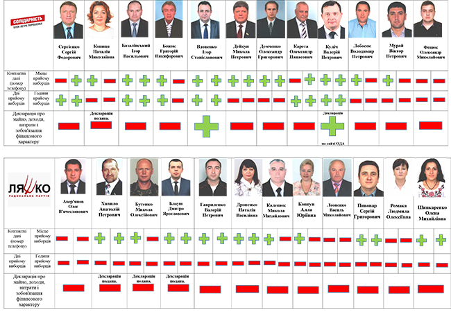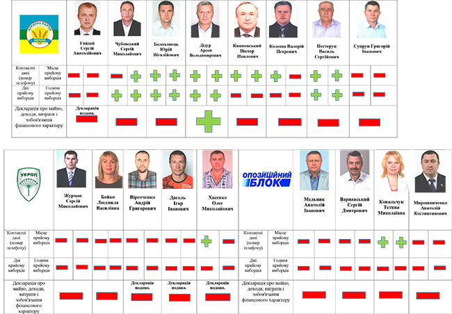 – В разделе сайта «Депутаты», согласно действующего законодательства должно быть обнародовано место приема избирателей, установлены дни и часы приема. Также, желательно размещать контактную информацию: номер телефона или адрес электронной почты. Из составленных нами таблиц вы видите, что довольно много случаев, когда такая информация отсутствует. Лидерами по «закрытости» выступают фракции «Укроп» и «Оппозиционного блока», – считает Александр Гашпар.