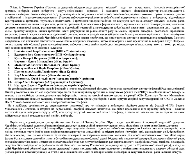 В исследовании отмечается, что если в Регламенте Черниговского городского совета прописана обязанность депутатов горсовета обнародовать на сайте горсовета свою декларацию, то, к сожалению, депутаты облсовета не прописали в Регламенте эту обязанность. При этом законодательно депутаты органов местного самоуправления не обязаны обнародовать свои декларации.