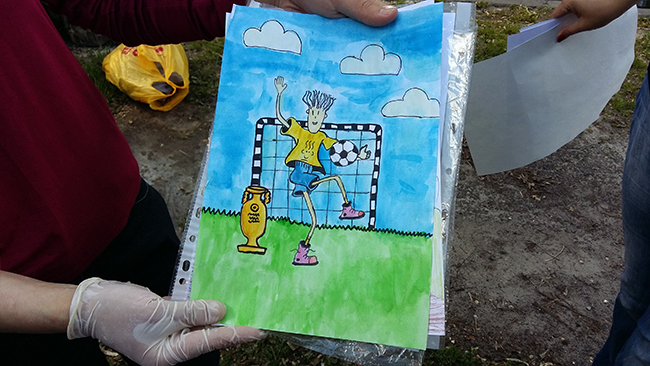– Я с детства увлекаюсь футболом. Он мне очень нравится. И после того, как я пришла на стадион им. Ю. Гагарина, мне захотелось в нем что-то изменить в лучшую сторону. Я узнала о конкурсе Черниговского национального технологического университета «Солнечные лучи» и приняла в нем участие. Смысл конкурса заключался в том, чтобы написать эссе, или плакаты, или нарисовать рисунки о том, что ты хочешь улучшить в своем городе. Я написала эссе о том, что я хочу изменить на стадионе, – рассказывает Маргарита Плахута. – Конечно, написала много всего, но потом узнала, какую сумму выделяют и поняла, что на все, что планировала, не хватит. После того, как я победила в конкурсе «Солнечные лучи» был написан проект, на реализацию которого выделили 10 000 грн. Сегодня мы готовим забор стадиона к нанесению на него рисунков. В качестве идеи рисунков будут взяты работы победителей конкурса среди учащихся 5-11 классов всей области. Уже завтра состоится награждение победителей и начнется раскраска забора.