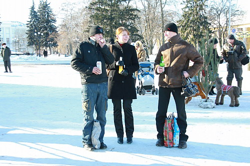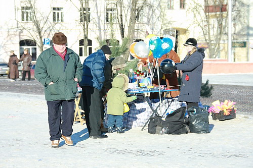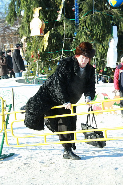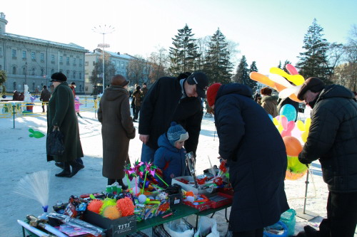 Сегодня, 2-го января, на центральной елочке нашего города народ продолжает гулять и веселиться. Днем контингент в основном мамы с детьми и молодежь. Для горожан тут же организованы такие нехитрые забавы, как катание на пони, фотосессия с Дедом Морозом и продажа новогодних сувениров. Так, например, 1 круг на пони вокруг елочки стоит 10 гривен. Мы так же поинтересовались у жителей города и Деда Мороза, как они отмечали 2009-й год и каких перемен ждут.