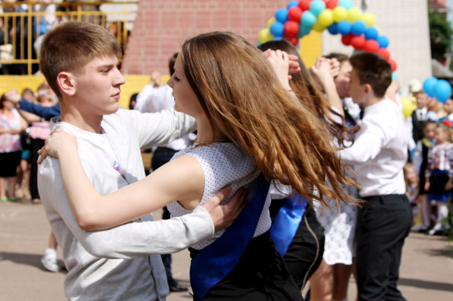 Трепетная обстановка расставания и прощания с учителями и друзьями. Звучат поздравления от младших школьников, традиционный вальс выпускников, и в небо взлетают воздушные шарики.