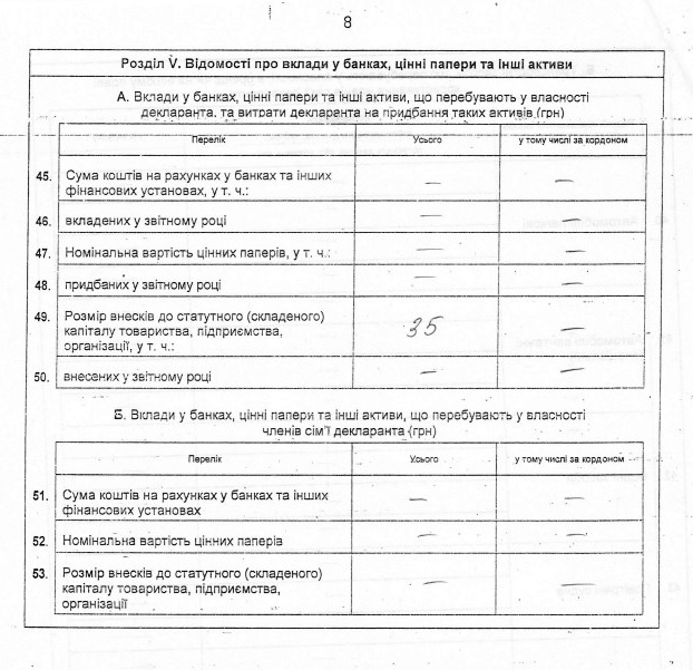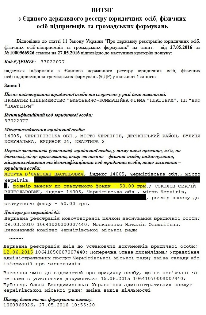У декларації за 2015 рік В’ячеслав Летута вказав внесок до статутного капіталу підприємств – 35 грн. Саме стільки до червня минулого року він мав у ПП «Виробничо-комерційна фірма «Платінум», співвласником якої він є з 2010 року.