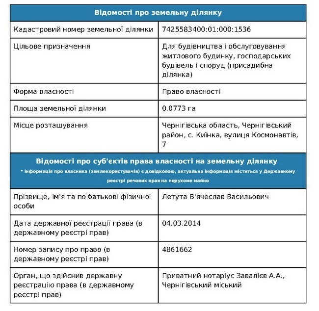 Будинок розташований на ділянці 0,077 га. Земля також зареєстрована на В’ячеслава Летуту.