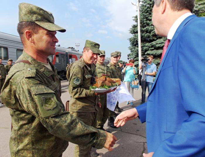Командир третьего мотострелкового отделения майор Виталий Соколов рассказал корреспонденту газеты о том, что на данный момент в эшелоне вместе с ним прибыло 214 военнослужащих, кроме того, он добавил, что каждый день будут подъезжать солдаты, будут пополняться ряды военнослужащих.