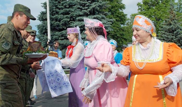 Фольклорный ансамбль «Веселые девчата» исполнил величальную песню «Рады мы вас видеть, дорогие наши…». Воинам вручили хлеб, соль и приготовленного для гостей зажаристого молочного поросенка…