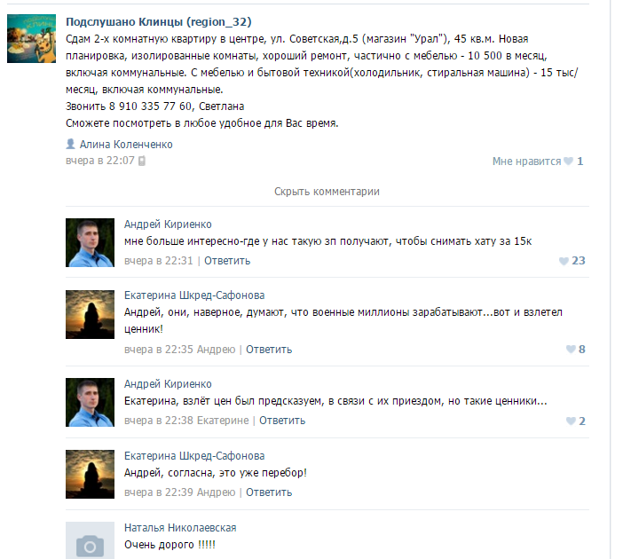Жители Клинцов уже реагируют на приезд военных в соцсетях. Некоторые из них критикуют военных, из-за непристойного внешнего вида, другие решили на них подзаработать. Так, жительница Клинцов Алина Коленеченко поставила объявление о сдаче 2-комнатной квартиры в центре города с ремонтом. За нее просит с коммунальными услугами - 15 тысяч рублей, что в пересчете на гривны - 5700. Пользователи в комметариях под объвляением объясняют столь высокую цену приездом в городок сотен военных.