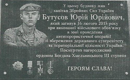В честь Героя Украины, 25-летнего капитана Юрия Бутусова, который 16 февраля прошлого года погиб под Дебальцево, 5 июня в Чернигове на улице Мстиславской, 38 открыли мемориальную доску.