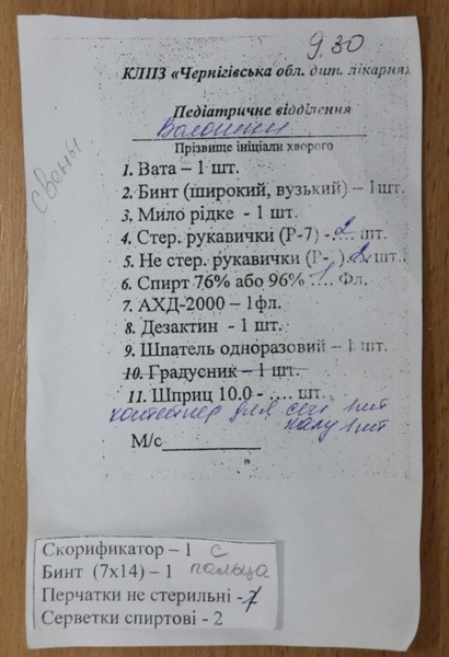 Пока ходил, заведующая отделением уже начала осматривать ребенка и на завтра (сына оформили на дневной стационар) назначает сдать анализы (кал, моча, кровь из пальца, кровь из вены). И тут снова «сюрприз». На посту нам дают список того, что необходимо купить для этих процедур.