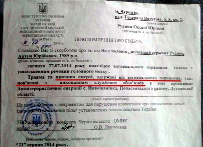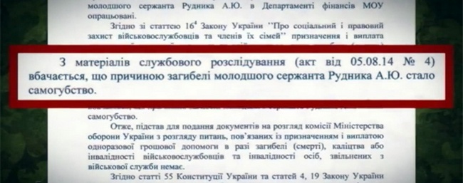 Вдова собрала все необходимые документы и отправила их в Киев. В конце сентября 2014-го пришел официальный ответ из департамента финансов Минобороны Украины, который потряс семью Рудник. В документе говорилось: "Из материалов служебного расследования следует, что причиной гибели младшего сержанта Рудника А.Ю. стало самоубийство. […] То есть оснований для подачи документов на рассмотрение комиссии Министерства обороны Украины по вопросам, связанным с назначением и выплатой единовременной денежной помощи в случае гибели (смерти), увечья или инвалидности военнослужащих и инвалидности лиц, уволенных с военной службы, нет".