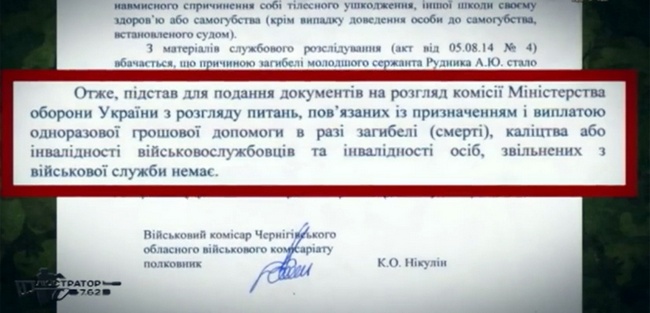 Отрывок из официального документа об отказе в выплате, где указано: "Из материалов служебного расследования следует, что причиной гибели младшего сержанта Рудника А. Ю. стало самоубийство". Скриншот телепрограммы "Люстратор 7.62"