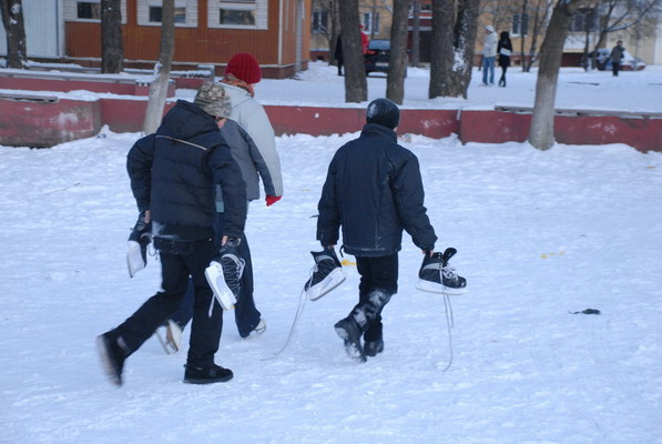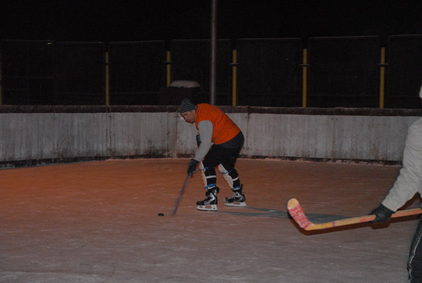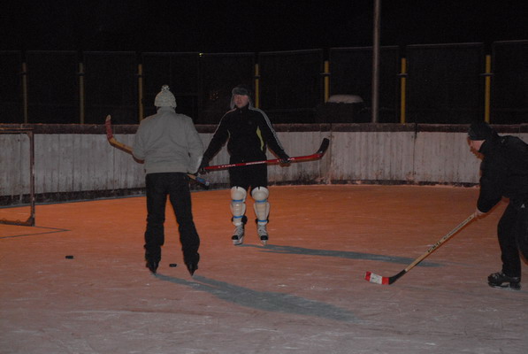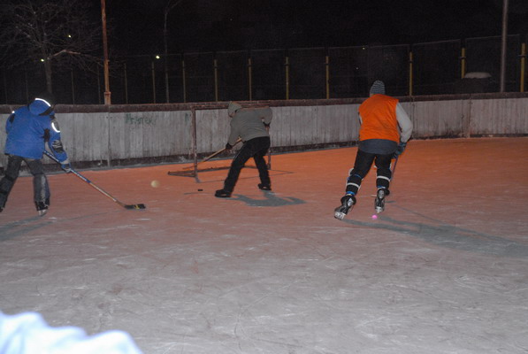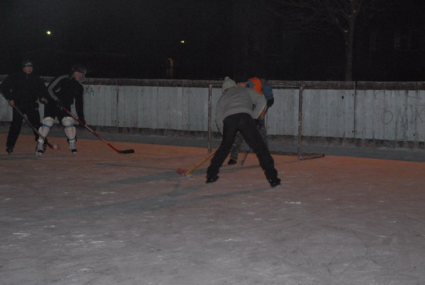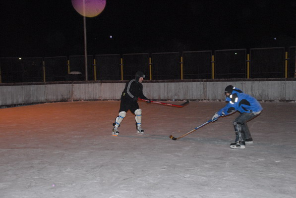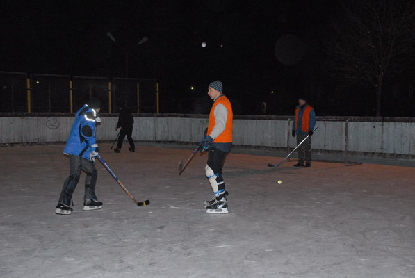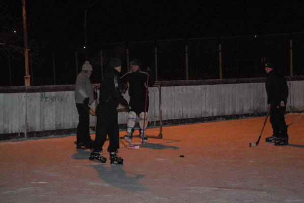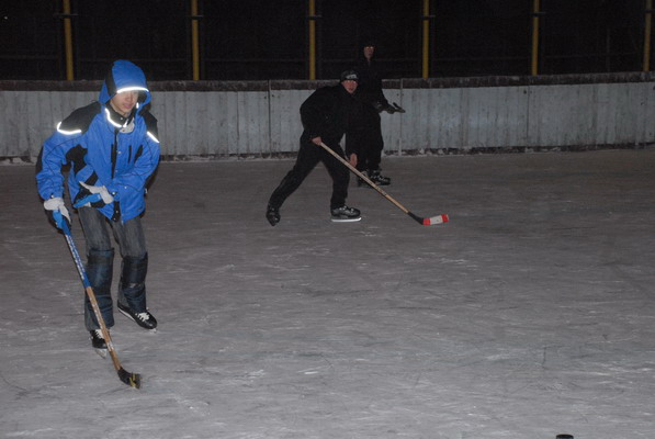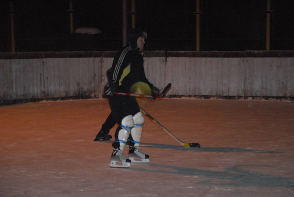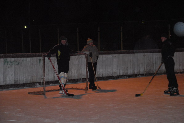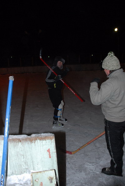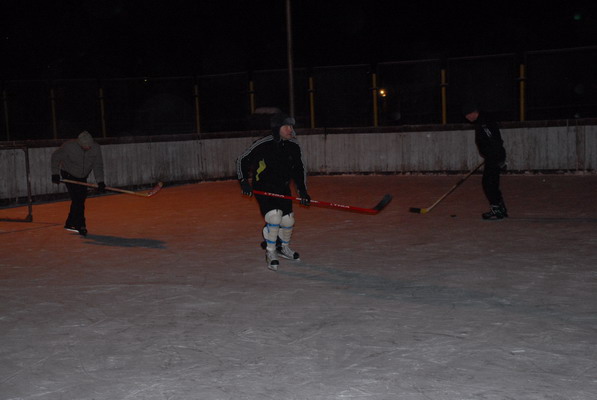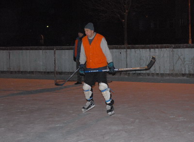 К слову сказать, коньки у них свои, хотя на катке есть пункт проката. Играют вечером, чтобы не мешать детям кататься. Шайба резиновая, но бьется больно. Для безопасности на коленях у спортсменов щитки. Директор спортивных коммунальных сооружений нашел их в кладовке — остатки от ранее существовавшей команды. Вечерни хоккейные баталии уже вошли в систему и с каждым разом на площадке все больше любителей хоккея.