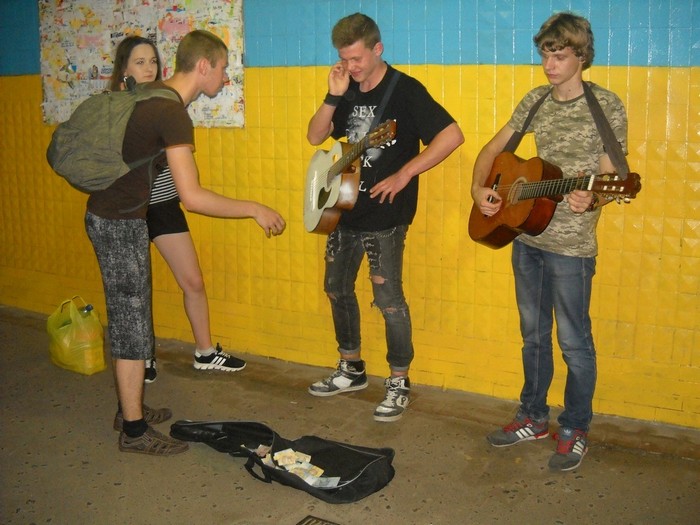 - Когда как, – отвечает Влад. – Вчера 150 грн. люди дали, позавчера 220, сегодня, вот, - 70 грн., одно яблоко и две конфетки. Но как бы там ни было – мне хватает, а иногда и родителям даю немного денег. Раньше вот мы с Серёгой на стройке подрабатывали, а теперь я там работать не хочу – лучше уж тут играть и петь.