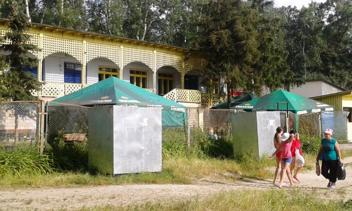 На пляже установлены две кабинки для переодевания. Есть павильон, в котором по умеренным ценам можно купить чипсы, гренки, печенье, орешки, мороженое. В продаже имеется вода, холодное пиво и даже алкогольные напитки! Уж не знаем, хорошо это или плохо…