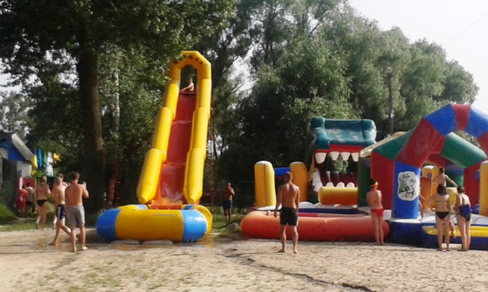 Я здесь каждый день с наступлением жаркой погоды. Из пляжных развлечений мы предлагаем батуты, в основном для детей. Батут-горка, на котором можно съехать вниз стоит 5 грн. за 1 спуск. Второй батут побольше, с бассейном стоит 20 грн. за 10 минут.