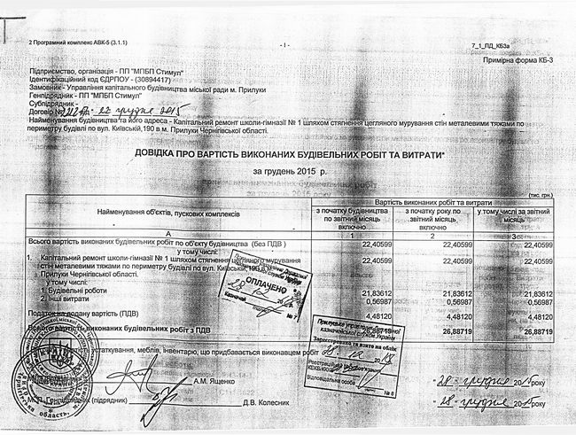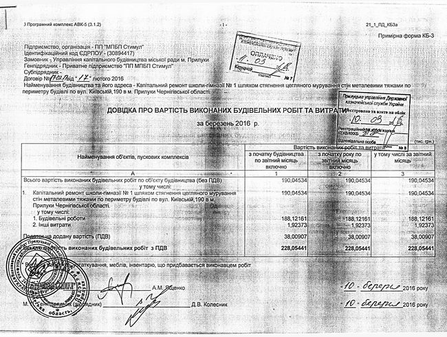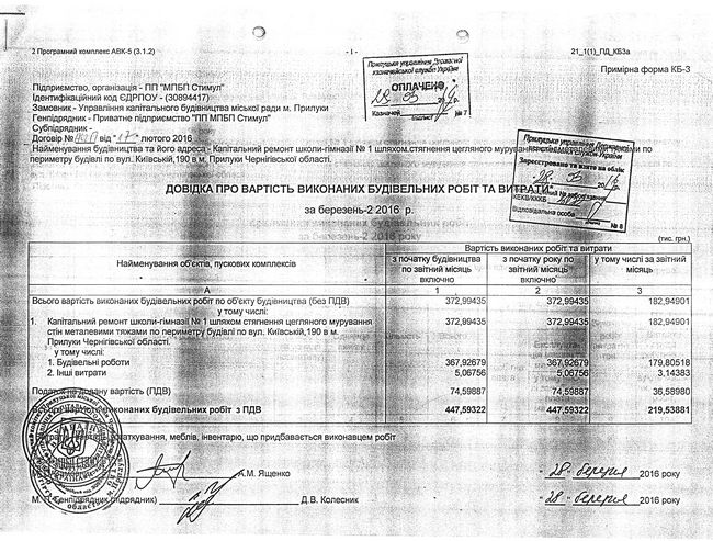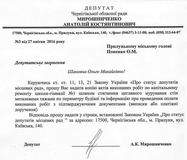 Аби проконтролювати використання бюджетних коштів, 20 січня 2016 року депутат Прилуцької міськради від «Опозиційного блоку» Олексій Гавриш зробив депутатське звернення, згідно з яким йому надали весь пакет документів. Включно із договором, де прописана вищевказана сума у майже 850 тисяч гривень. Минув час – і 27 квітня, коли було закінчено ремонтні роботи, щоб усе перевірити, вже я, як депутат обласної ради, надіслав до міського голови Прилук запит із проханням надати акти виконаних робіт капітального ремонту школи-гімназії №1. В отриманих документах на мене чекав сюрприз. Виявляється, по актах використано всього 474 тисячі 480 гривень 41 копійка. Чомусь після офіційних запитів депутата Олексія Гавриша і мого сума у звітній документації стала практично вдвічі меншою за прописану в договорі.