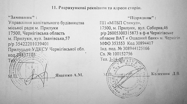 На кожному акті виконаних робіт, як і на договорі підряду, стоїть підпис однієї й тієї ж людини – начальника управління капітального будівництва Прилуцької міськради. Спочатку цей посадовець ніяк не міг визначитися із необхідною для ремонту сумою, потім через його розрахунки місто ледь не втратило 375 тисяч гривень. У цій ситуації мене дивує пасивна позиція мера.