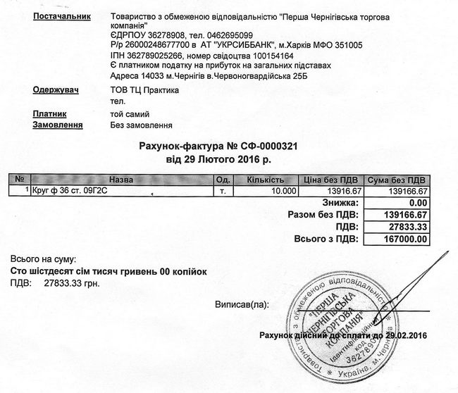 Звідки різниця? – запитає хтось. Виявляється, вся справа у накрутках на матеріали. До прикладу, круглу сталь С345, використовувану підрядником для стягнення споруди, спочатку, до депутатських звернень, планувалося придбати по 33 тисячі гривень без ПДВ за тонну, хоча її ринкова вартість лише 16,7 тисячі. Як підтвердження, передаю у ЗМІ копію рахунку, наданого одним із чернігівських товариств. Після офіційних запитів Олексія Михайловича і мого ціна на круглу сталь С345 у актах виконаних робіт різко впала до 17,5 тисячі. Проаналізувавши різницю вартості на матеріали до і після, схиляюся до висновку, що ми не допустили скоєння злочину, не дали розтратити з міського бюджету 375 тисяч гривень, які можна використати на облаштування дахів у дитсадках чи ремонт відділень центральної міської лікарні. Я неодмінно передам усі ці матеріали до правоохоронних органів. Досить наживатися на людях!