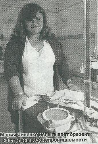 — Это прибор для определения водонепроницаемости брезента, — показывает она спецаппарат.