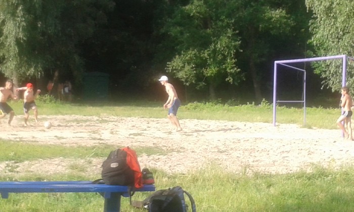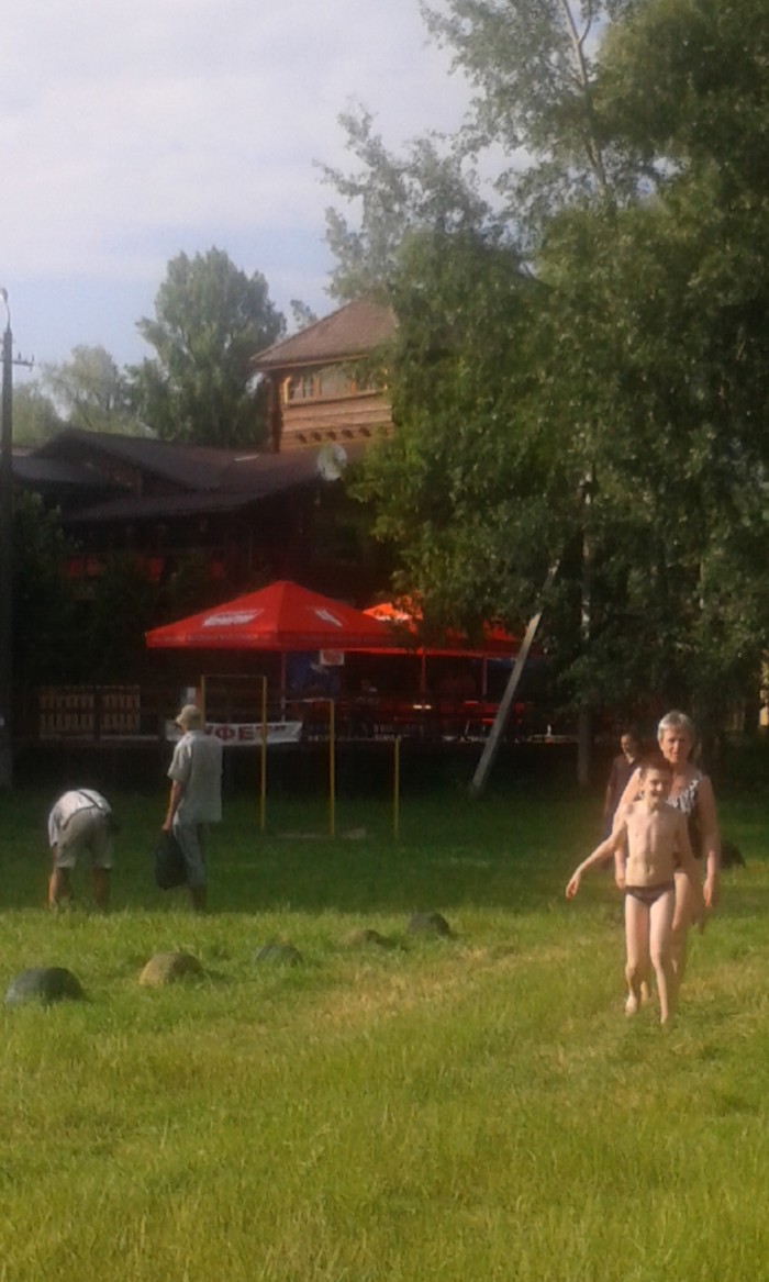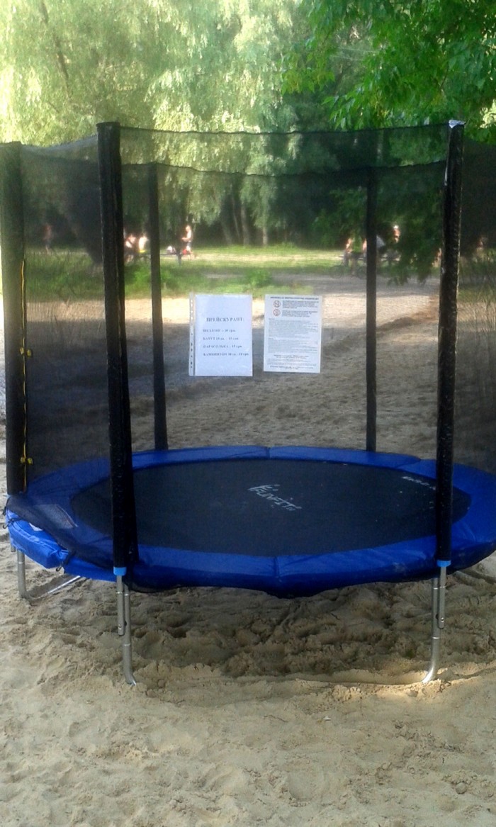 Рядом аптечный пункт с изображением красного креста. По левой стороне большая зеленая зона с деревьями и травкой. На ней расположено (единственное) кафе «Золотой Берег», турники, игровая площадка для детей, небольшое футбольное поле. Что удивительно, вообще нет надувных горок, различных игровых батутов для деток. Возможно, это еще в перспективе? Мы обнаружили только один батут-сетку, на котором можно попрыгать 15 мин. за 10 грн.