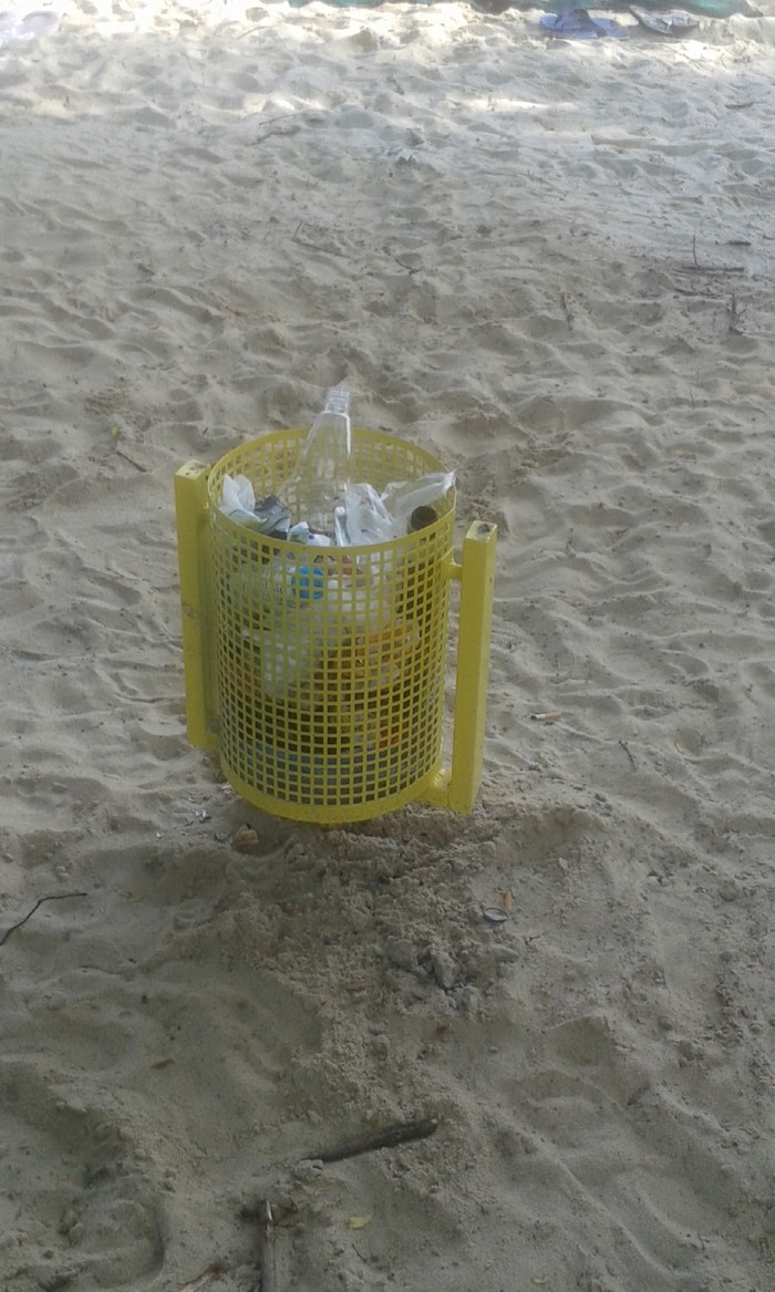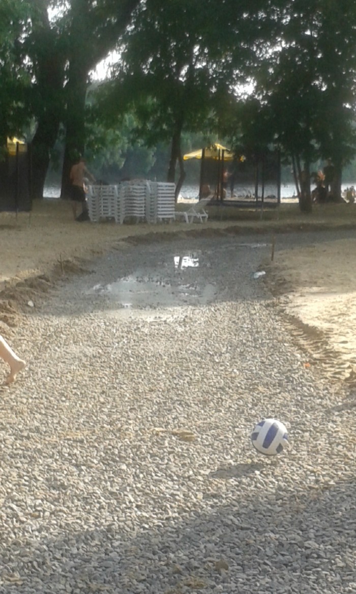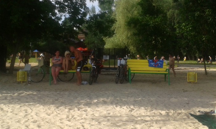Посередине песчаной зоны один за другим установлены пляжные зонты. Было бы хорошо, если бы под зонтиками вокруг были небольшие лавочки, чтобы можно было не только полежать на покрывалах, но и посидеть на лавочке и положить свои вещи. Немного выше в тени деревьев размещены удобные лавочки со спинками. С обеих сторон каждой лавочки есть небольшие металлические урны. Но когда урна переполняется, (мусор в течение дня, судя по всему, никто не убирает) то ее содержимое вываливается тут же на песок.