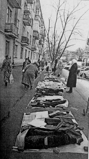 В два ряда торгующие выкладывают свой домашний скарб, среди которого можно найти старинные статуэтки, перстни, дефицитные в советское время книги, давно уже немодные туфли-лодочки, спицы, шерстяные нитки, кукол, разукомплектованные сервизы... Каждые выходные сюда приходят те, кто оказался брошенным на произвол судьбы, у кого уже нет сил бороться с нищетой. Сюда приходят старички-пенсионеры... Чтобы выжить, им приходится выноситьть из дома самое ценное, что у них есть, и доллго уговаривать каждого, кто проявил интерес к той или иной вещи, купить ее буквально за копейки. Они со слезами на глазах отдают свои любимые вещи и в то же время просто счастливы, что взамен им дают деньги. Ведь дли них важен каждый пятак.