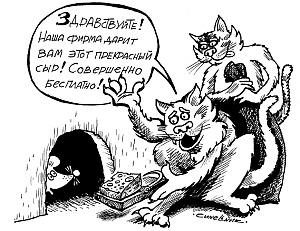 "Здравствуйте! - расплылся в улыбке рыжий. - Меня зовут Сергей, я официальный представитель компании (далее он пробормотал что-то англо-русское, типа "Копыто дейли интертеймент"), офис которой находится по адресу: проспект Ленина (набор цифр). Корпорация, в которой я пять лет работаю начальником отдела маркетинга, организует на днях в "Орбите" выставку товаров наших заграничных партнеров. Обязательно приходите! Но, предваряя это мероприятие, мы приняли корпоративное решение провести нетрадиционную рекламную акцию. Из громадной базы данных центральный компьютер выбрал вас и еще нескольких счастливцев, бесплатно получащих товары, которые затем будут продаваться на выставке за большие деньги".