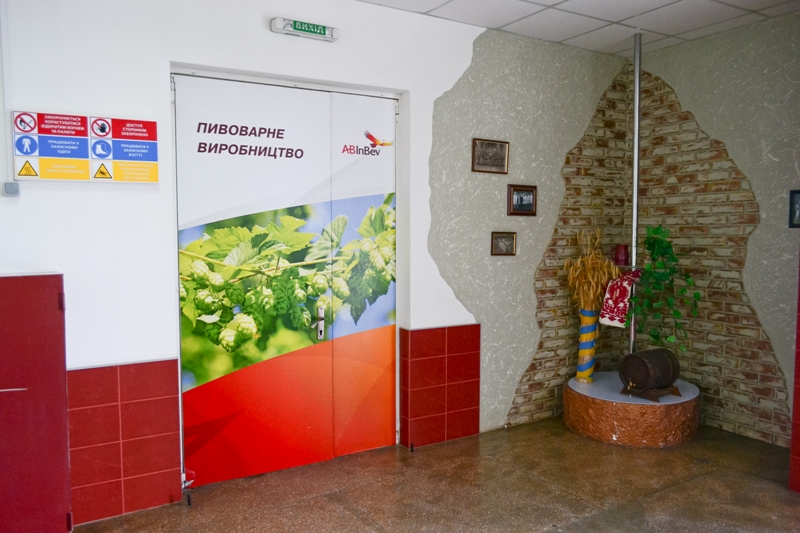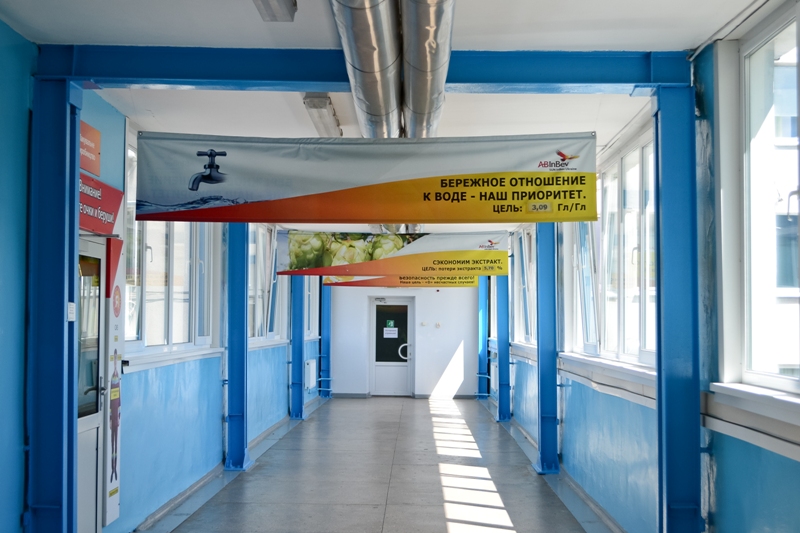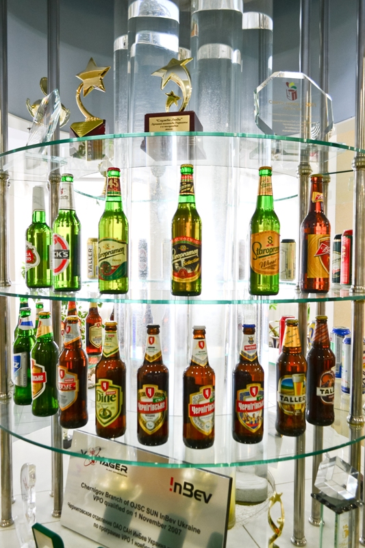 Дипломы на стендах в холле самые разные, есть и новенькие 2015 года. На других стенах висят стенды с информацией о вакансиях и достижениях предприятия, например, «2800 рабочих дней без несчастных случаев» и другие. Но самое интересное здесь – это стойка с ассортиментом продукции, которую выпускает завод – конечно же, это пиво самых разных марок.