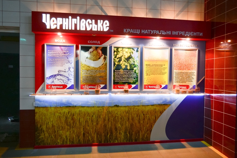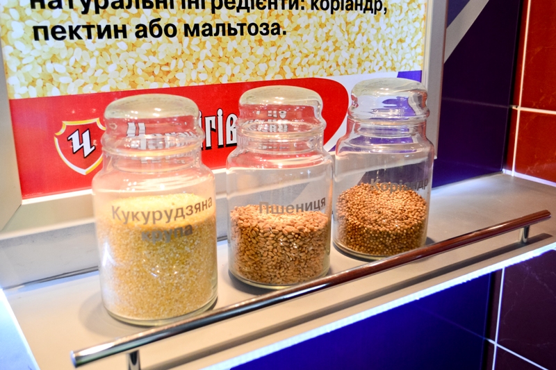 В этом же зале есть небольшой стенд, где показаны все ингредиенты, которые входят в состав пива – вода, ячмень и солод, а также кукурузная крупа, пшеница, кориандр и пектин, которые идут как добавки в отдельные сорта пива.