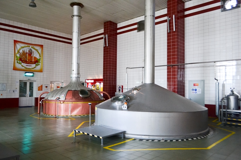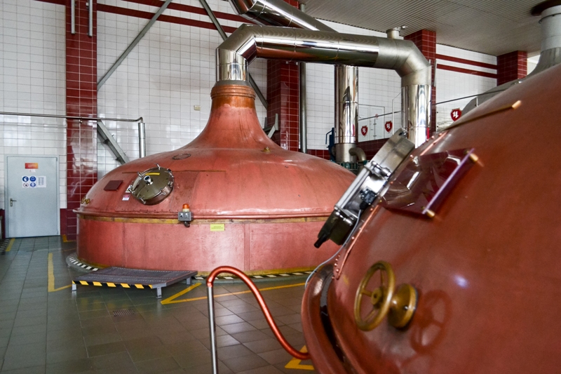 И вот дверь с вывеской «Пивоваренное производство». Проходим внутрь – и снова коридор. Но теперь все намного ближе. Входим в помещение с большими то ли баками, то ли котлами. В этом зале очень жарко. Здесь варится сусло, сначала без хмеля, а затем и с его добавлением. Баки вроде бы не очень большие, но объем каждого из них на самом деле огромный – около 75 гектолитров, т.е. это полноценная железнодорожная цистерна. В них кипит и бурлит желтая мутная жидкость. Это и есть основа для любого пива - сусло. В конце зала стоит два желто-красных медных бака, в которых такое же сусло, но уже с добавлением хмеля. Судя по табличке с надписью, они ровесники завода, сделаны в 1976 году в Чехословакии. Еще дальше, на возвышении, еще две такие же емкости – в них будущий напиток охлаждается.