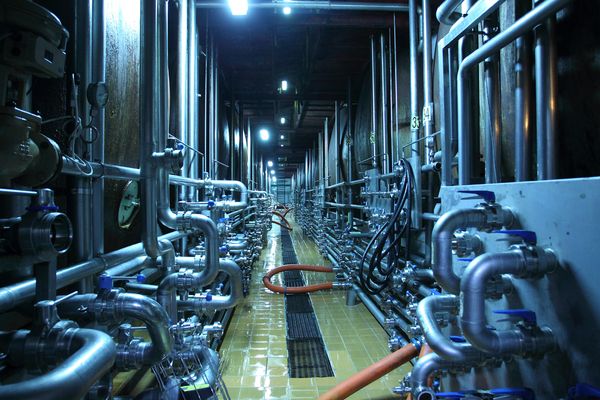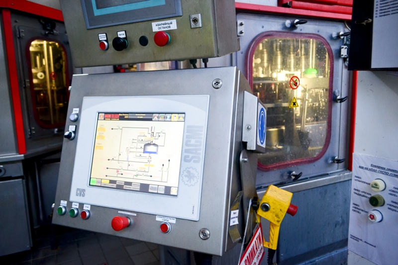 Мы возвращаемся в коридор и поворачиваем в одну из дверей, которую пропустили ранее – на фасовочную линию. Здесь как раз и нужно одеть очки и заткнуть уши – слишком шумно. Весь зал – это сплошные машины и механизмы, конвейерные линии, трубы и трубки. Чувствуешь себя как внутри какого-то огромного работающего механизма и, если честно, страшновато касаться чего-либо, чтобы не сломать.