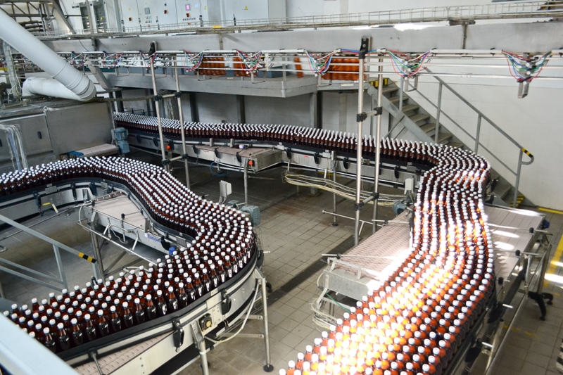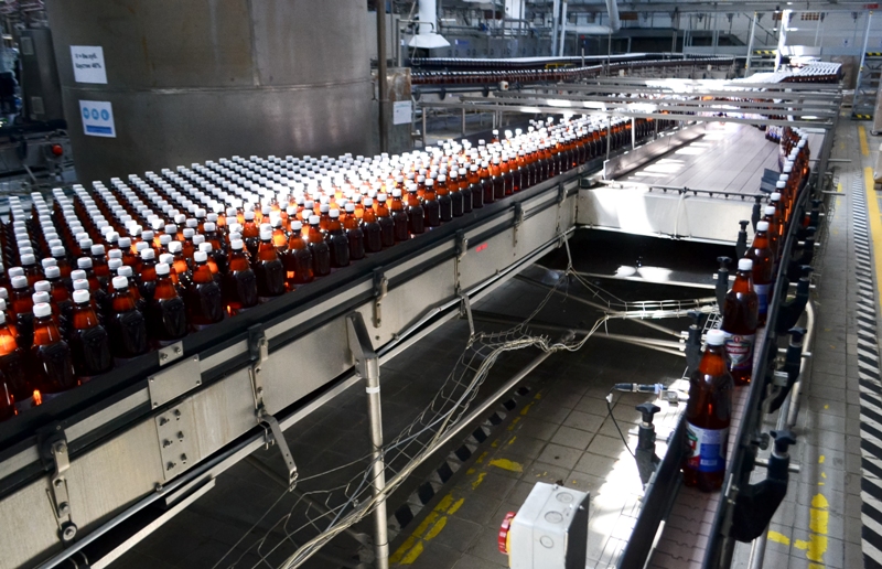 Первая линия, к которой подходим – разлив пива в пластиковые бутылки по 1,2 литра. Пустые бутылки подаются по верхней линии, в квадратных «ящиках» со стеклами в них наливается пиво, после чего длинной извилистой змеей они выползают на нижнюю линию. В круглых барабанах на них клеится этикетка, после чего, таким же извилистым путем бутылки продолжают свой путь, собираясь в длинный и уже довольно таки широкий поток.