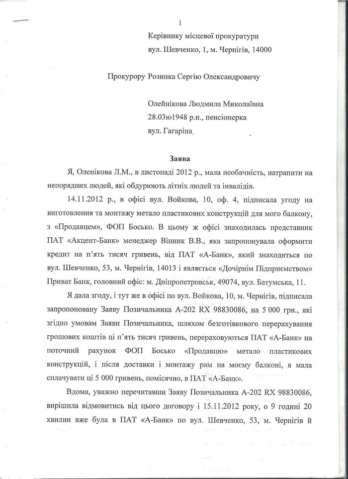 По документам, которые предоставила Людмила Николаевна, по этому делу действительно есть вопросы. Самое существенное — это то, что «кредит» выдавал ПАТ «Акцент-Банк» (на рынке услуг с 2011 года - прим.авт.) не по договору, а на основании Заявления заемщика. Деньги, а это авансовый платеж, - 5150 гривен, перечислялись продавцу окон — ФОП Босько Д.О. Оплачивать его должна была Людмила Николаевна — по 297 гривен ежемесячно на протяжении трех лет.