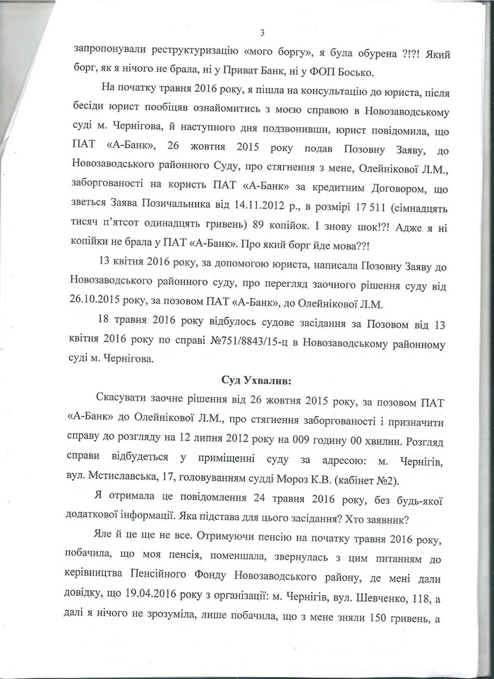 - В конце марта этого года мне позвонили и сказали, что банк предлагает мне реструктуризацию долга. Я в недоумении: «Какая реструктуризация? Какой долг? Я не брала у вас ни копейки?» Меня это напугало, я пошла к юристу. О заочном решении суда меня даже никто не оповестил. Когда я наняла адвоката, она взяла решение суда и сообщила, что вынесено решение наложить на меня штраф за не уплаченный долг - 17 500 грн.