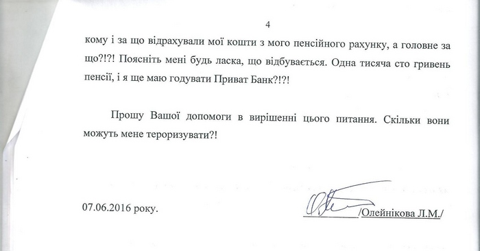 Потом, когда получила пенсию, обратила внимание на то, что сумма меньше, чем обычно. На каком основании? Пошла выяснять в Пенсионный фонд. Там мне выдали справку, что с меня высчитывают деньги. В мае месяце и в июне высчитали. В первых числах июня я написала начальнику пенсионного фонда Чернигова и когда пришла за результатом, то исполнительная служба уже не высчитывала денег».