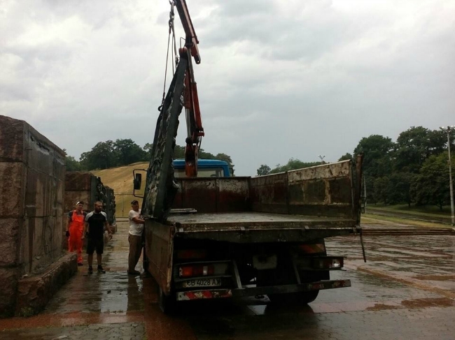 Ранее, наш сайт сообщал, что вечером, 24 июня, возле Болдиных гор, согласно решения исполкома Черниговского городского совета, начался демонтаж бронзовых барельефов, которые там стоят с 1986 года. На защиту исторических памятников пришло около пятидесяти жителей города.