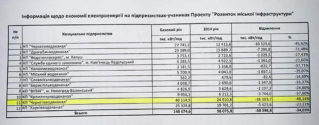 – Еще в 2008 году, когда было заключено Соглашение о займе между Украиной в лице Министерства финансов и Всемирным банком на основании проведенных конкурсов было отобрано четыре основных участника проекта «Развитие городской инфраструктуры». Городами-участниками проекта стали Чернигов, Ивано-Франковск, Одесса и Донецк. Позже Донецк выбыл из числа участников проекта и в законе о займе прописано три предприятия. В том числе, для КП «Черниговводоканал» – $14 830 000. Общая сумма займа составляла $140 млн. В результате получилось так, что была распределена не вся сумма займа. Поэтому начали подбирать города, которые могли бы взять кредит. Но при распределении оставшегося компонента было прописано одно условие: в проект можно включить только мероприятия, направленные на повышение энергоэффективности, которые в результате внедрения дадут сокращение энергозатрат, как минимум, на 15%. Поэтому второй кредит на $8 000 000, который мы взяли в 2009 году, был направлен исключительно на энергосбережение, – рассказывают специалисты предприятия.