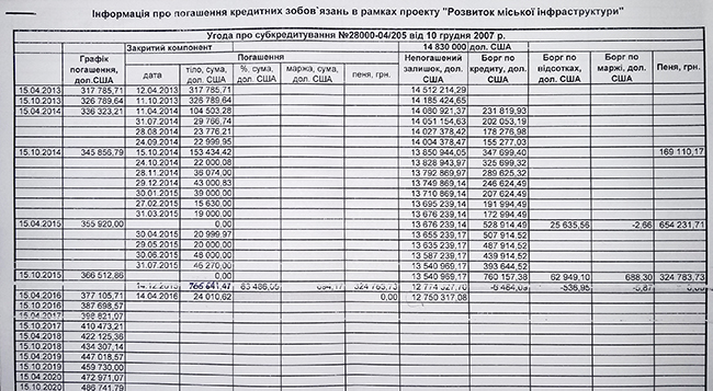В соответствии с договором о субкредитовании №28010-02/117 от 28.10.2009 между Министерством финансов Украины, Министерством по вопросам ЖКХ Украины и КП «Черниговводоканал», субкредитор (Минфин) рекредитирует КП «Черниговводоканал» субкредит в сумме $8 000 000 с одноразовой комиссией $20 000, на платной, возвратной, срочной основе. Официальный курс гривны к доллару на момент заключения этого договора составлял 8 грн. за $1. Согласно условиям, прописанным в договорах, срок реализации проекта определялся – до 30 июня 2015 года.