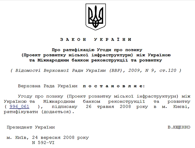 В соответствии с договором о субкредитовании №28000-04/05 от 10.12.2007 между Министерством финансов Украины, Министерством по вопросам ЖКХ Украины и КП «Черниговводоканал», субкредитор (Минфин) рекредитирует КП «Черниговводоканал» субкредит в сумме $14 830 000 с одноразовой комиссией $37 075, на платной, возвратной, срочной основе. Официальный курс гривны к доллару на момент заключения договора составлял 5,05 грн за $1.