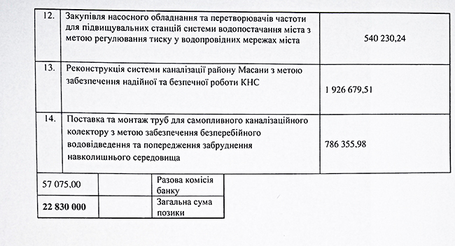 О реализации КП «Черниговводоканал» проекта «Развитие городской инфраструктуры» уже было писано-переписано. Чтобы не повторять сказанное ранее и для лучшего восприятия расходования кредитных сумм, все затраты КП «Черниговводоканал» представлены в виде таблицы, с указанием направлений финансирования и сумм, потраченных предприятием.