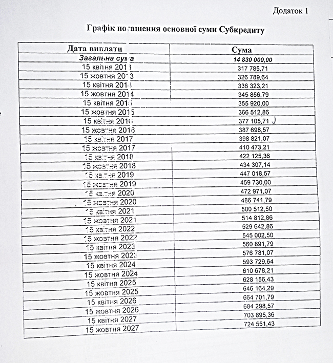 Как мы сказали выше, в условиях соглашения был прописан льготный период, во время которого «тело кредита» не гасится. Оба кредита должны гаситься два раза в год – 15 числа в апреле и октябре месяце.