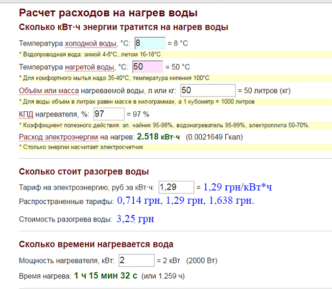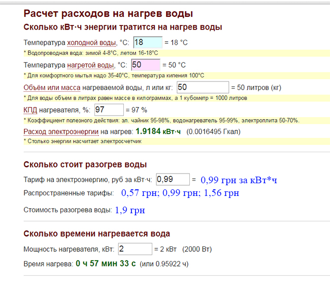 Итак, подставив соответствующие данные в программный калькулятор, мы выяснили, что теоретически, на нагрев 50 л воды до температуры в 50 градусов при тарифе 0,99 грн/кВт*ч: