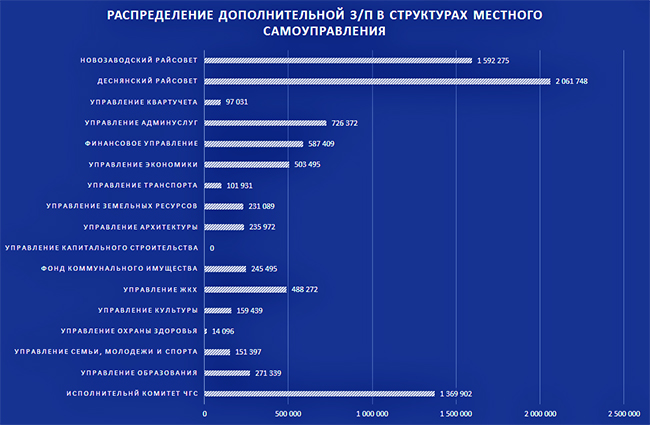 Безусловно, чиновники при делении бюджета не забыли и о себе любимых. Так, более 8 млн грн было выделено на повышение заработных плат 665 чиновникам местного самоуправления – на Черниговский городской совет и районные в городе советы. Даже средний прирост заработной платы, после добавления такой суммы, можно считать огромным, как для уровня з/п Чернигова в целом, где люди рады и 3000 грн.